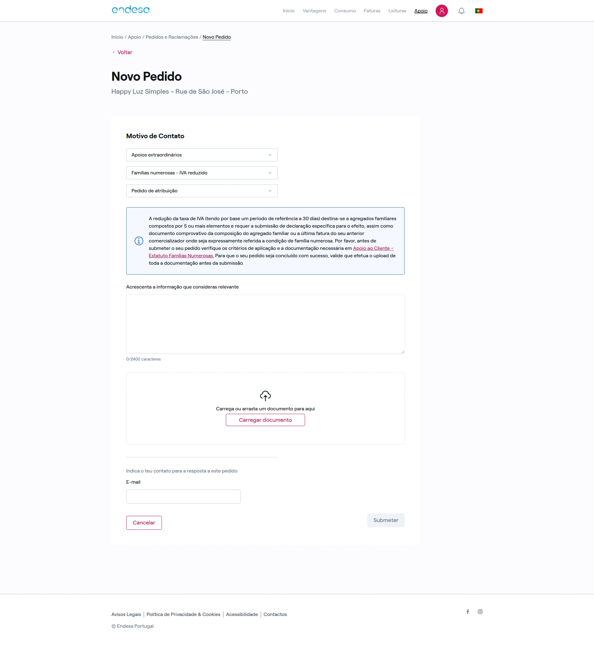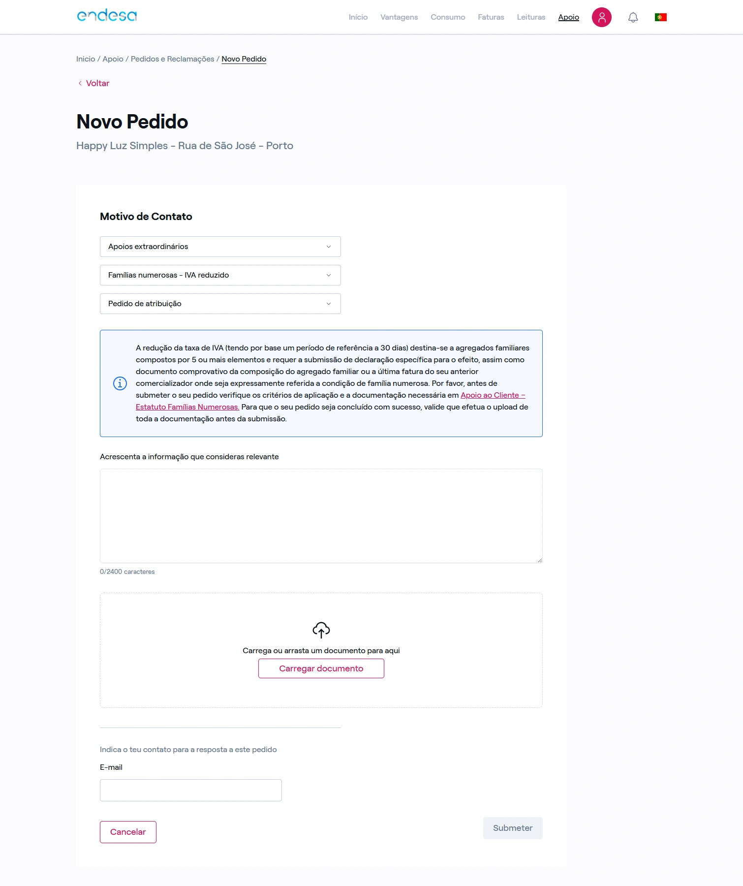 ► Se preferir fazer o pedido na área de cliente via My Endesa, deve escolher a secção Pedidos no menu principal > Pedidos e Reclamações > Novo Pedido. No formulário, selecione as opções Apoios Extraordinários > Famílias Numerosas – IVA reduzido > Pedido de Atribuição, e anexe a documentação necessária.