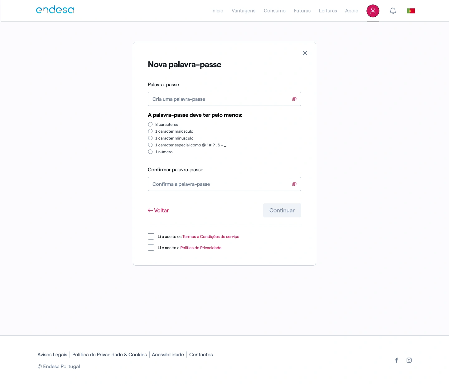 5. Inserir e confirmar a nova palavra-passe, respeitando os requisitos indicados, e aceitar os termos;