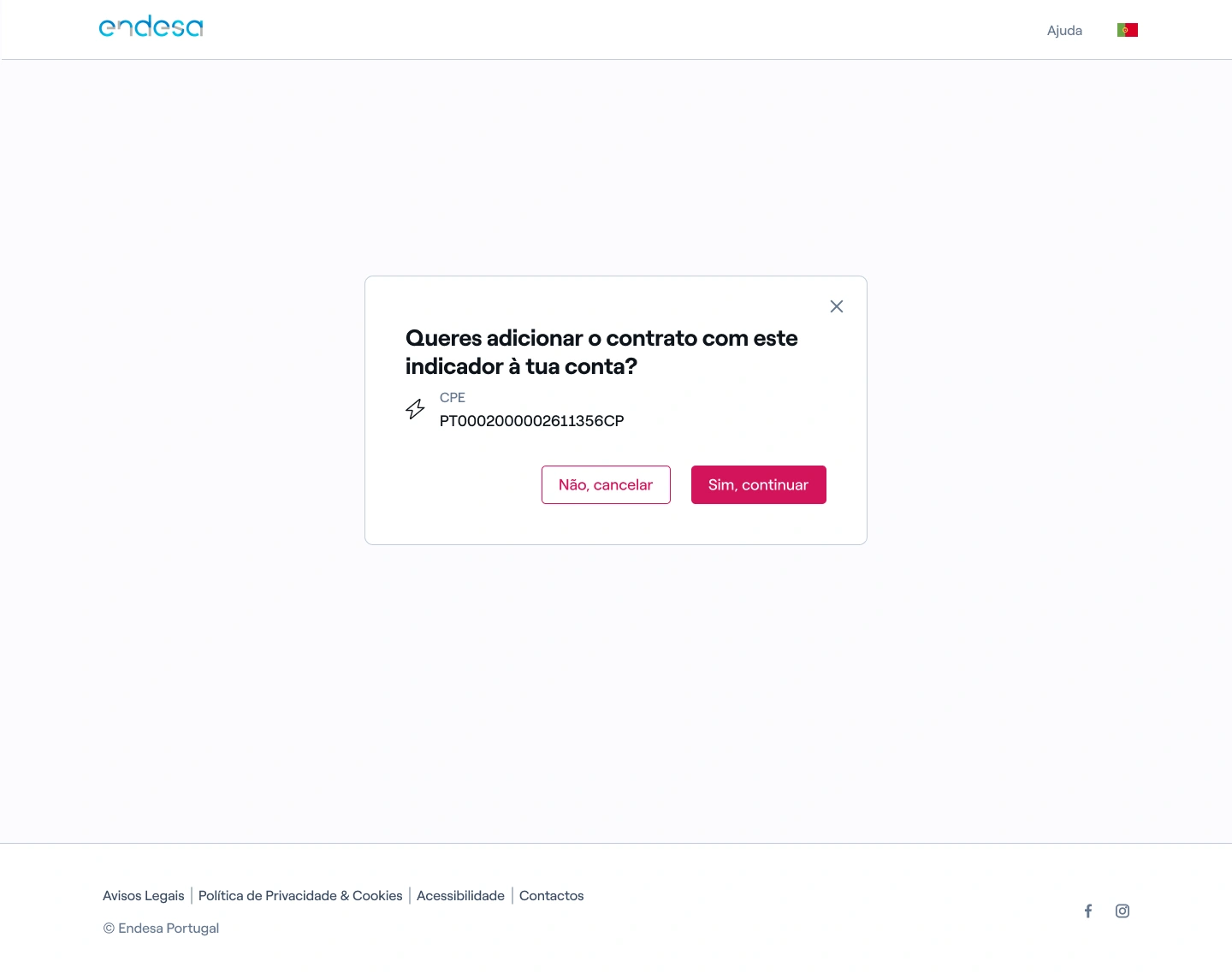 2. Confirme que o CPE e/ou CUI é o que corresponde ao seu contrato e selecione “Sim, continuar”;