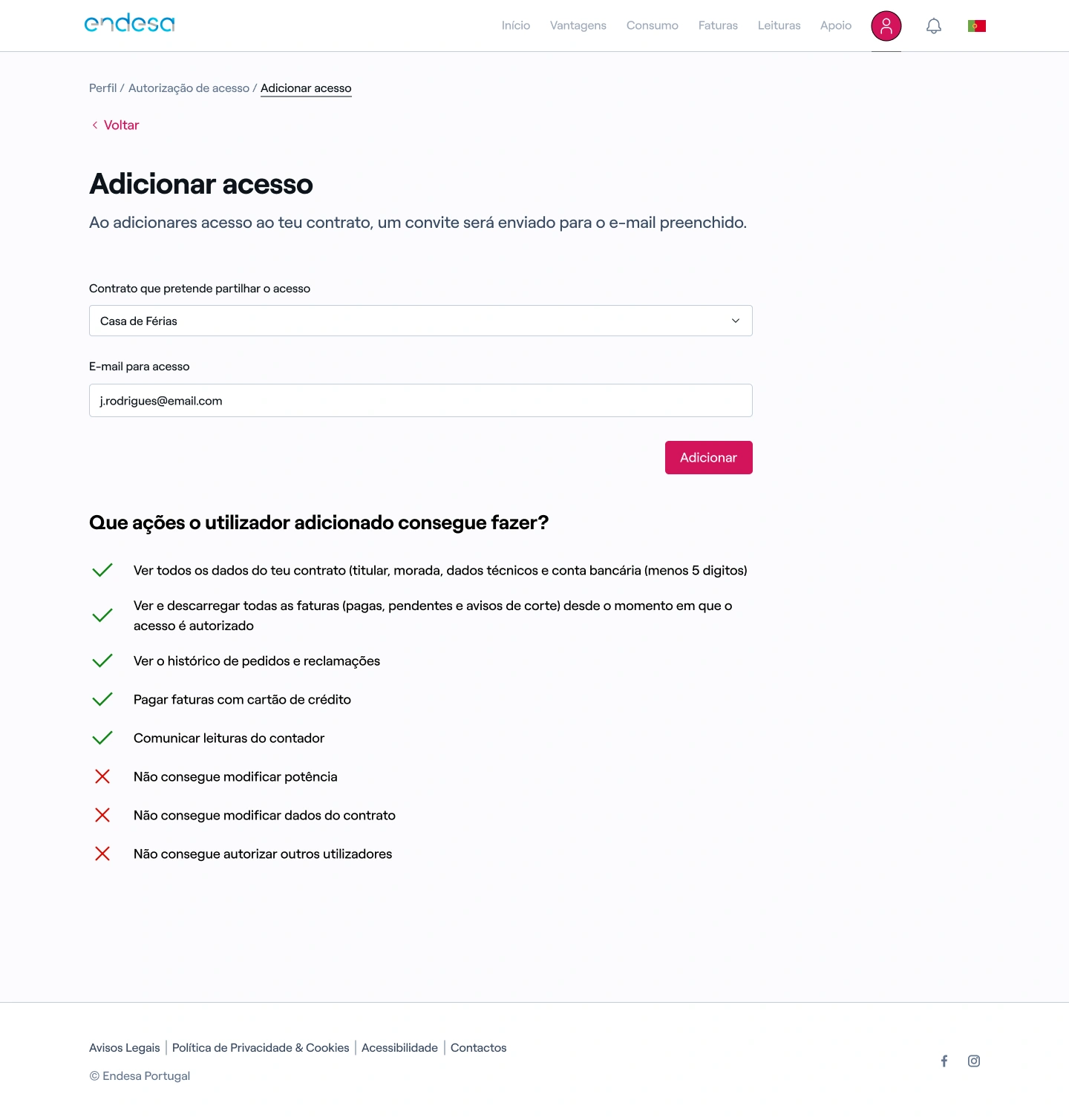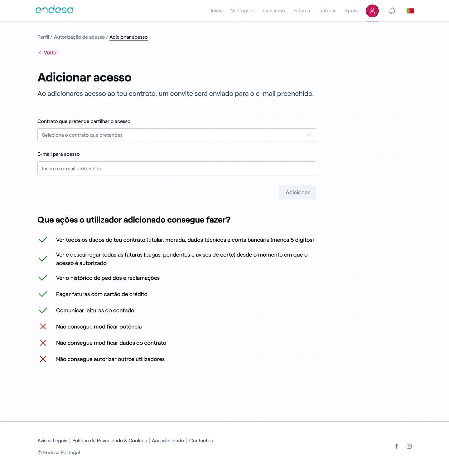 - Perfil: gestão dos dados de acesso e contacto, gestão dos detalhes do contrato, gestão de consentimentos e notificações, gestão da permissão de acesso do contrato a terceiros;