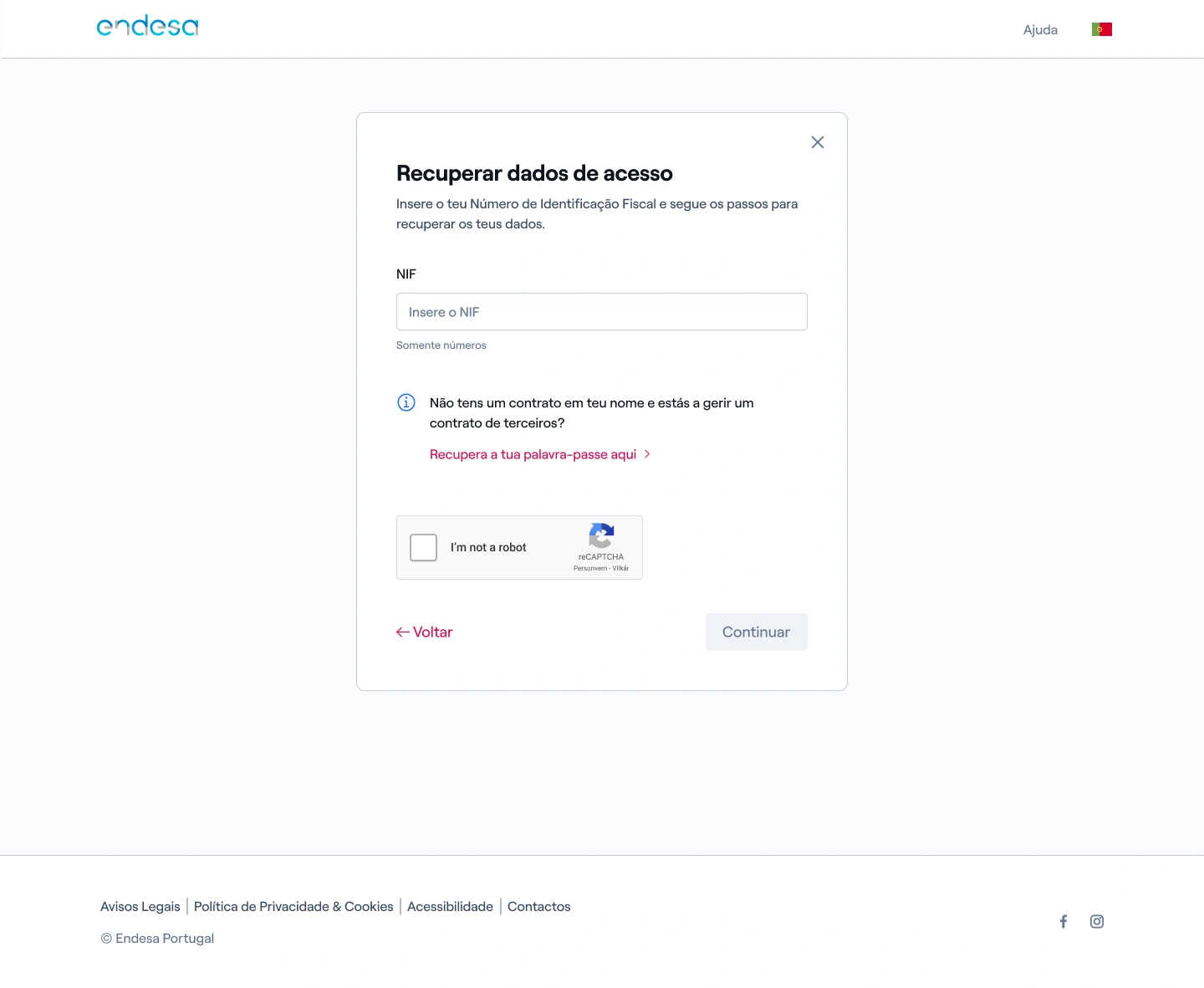 - Selecione a opção "Esqueci-me da minha palavra-passe" e introduza o NIF associado ao contrato;