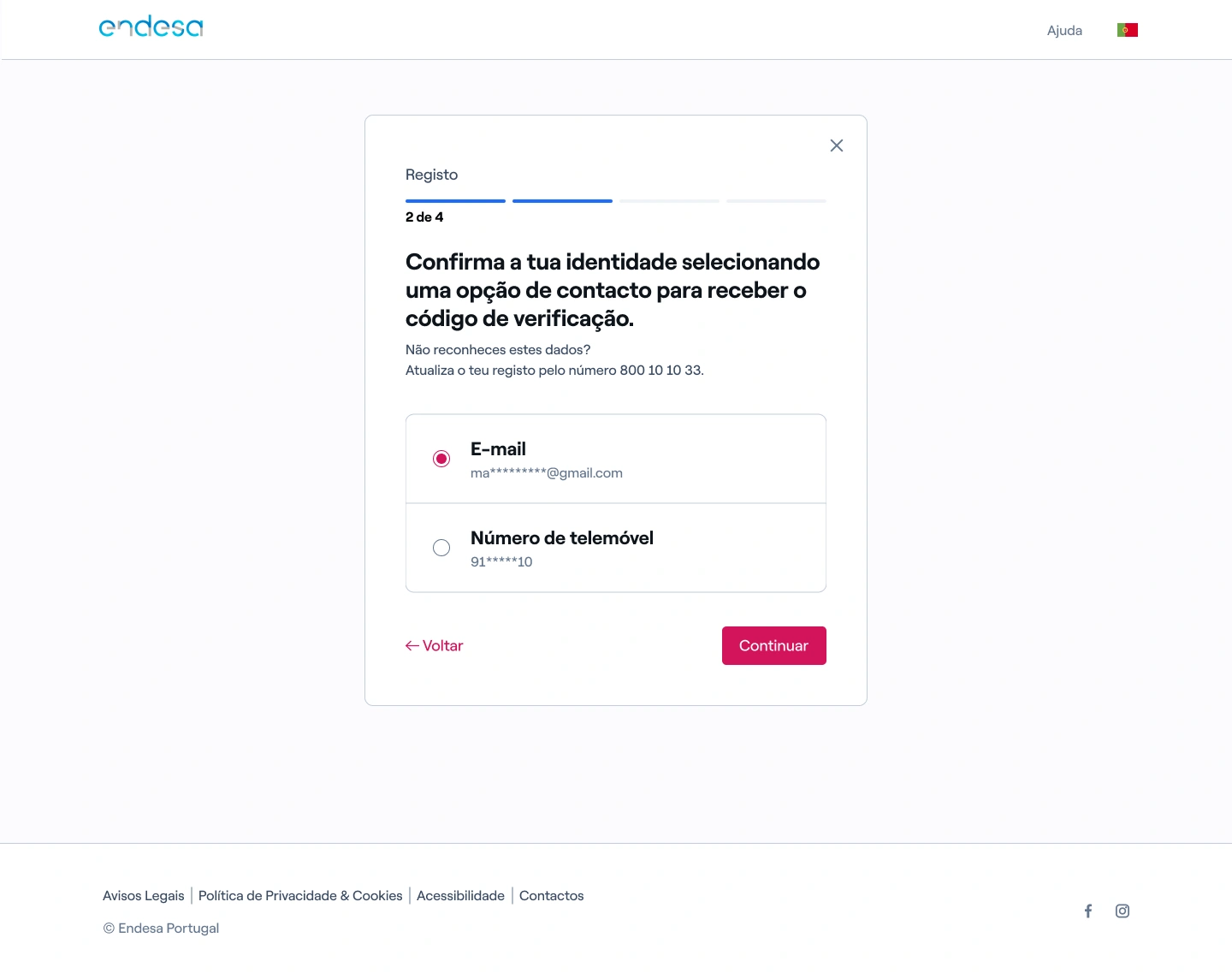 2. Selecione o método de contacto em que quer receber o código de verificação (e-mail ou SMS);