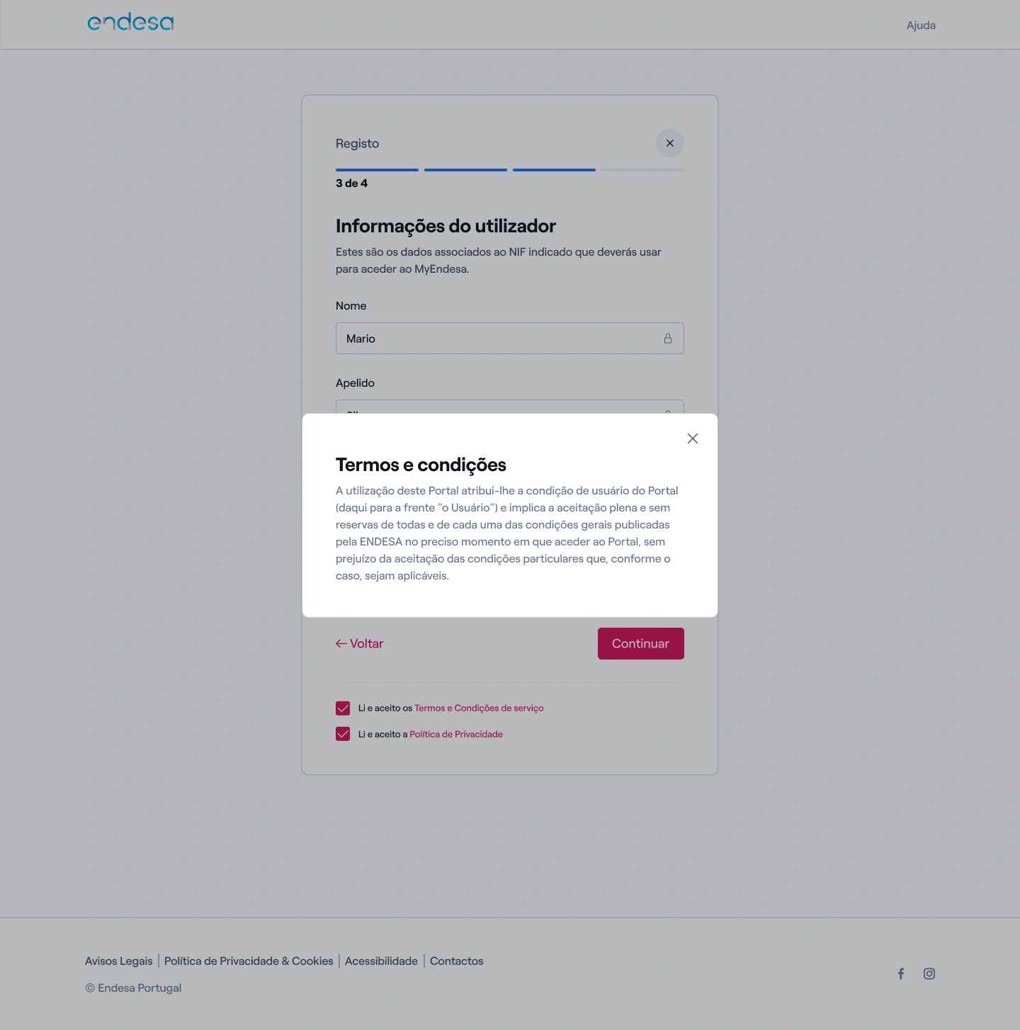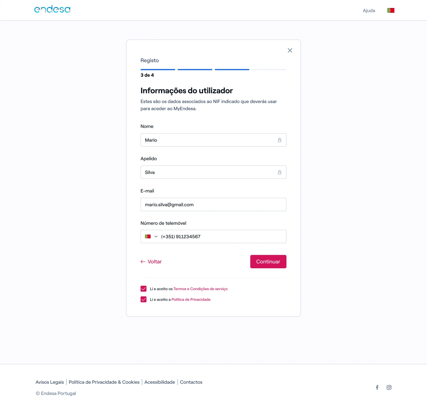 6. Após a validação, os dados associados ao NIF serão automaticamente preenchidos. Confirme os seus dados e aceite os Termos e Condições e a Política de Privacidade.