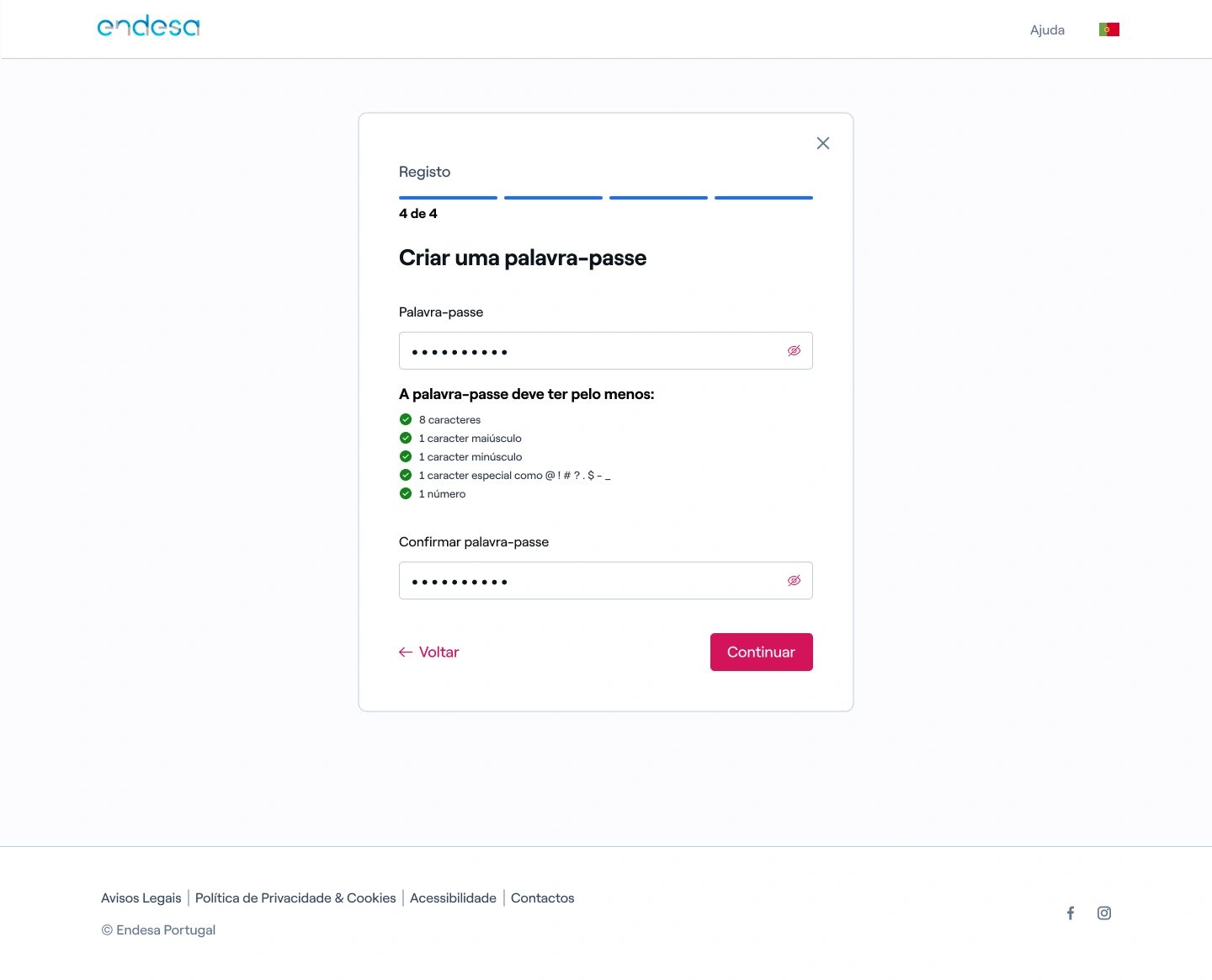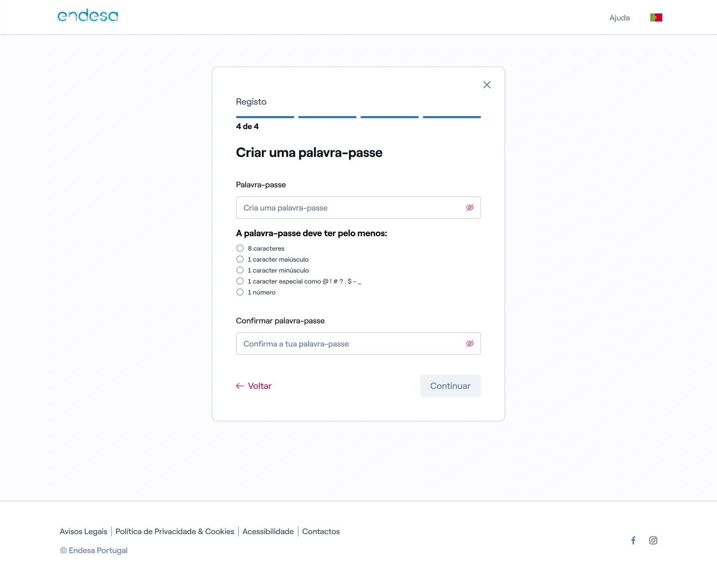 7. Crie e confirme a sua palavra-passe, respeitando os requisitos indicados.